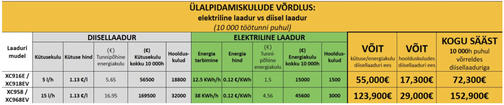 Üks juhtivaid rasketehnika tootjaid XCMG on koostanud detailse võrdluse, milles on kõrvutatud elektriliste ja diiselmootoriga laadurite ülalpidamiskulud Eesti turu tingimustes 10 000 töötunni lõikes. Võrdlus keskendub eeskätt kütuse- ja hoolduskuludele, mis moodustavad olulise osa masina kogu kulust.